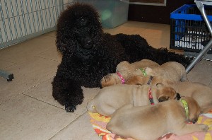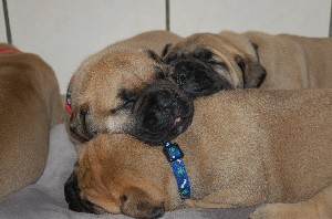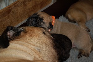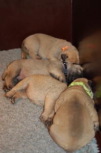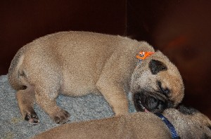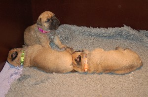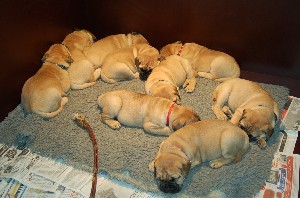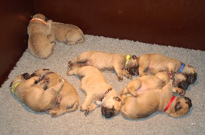 | Wat nieuwe foto's gemaakt op de dag dat de pups 3 weken oud zijn geworden. De heren en dames wegen inmiddels tussen de 2.700 en 3.000 gram. Ze doen het erg goed allemaal. | |