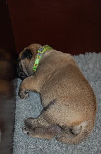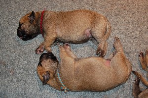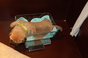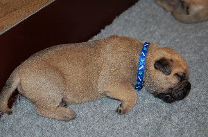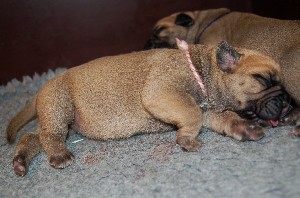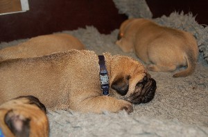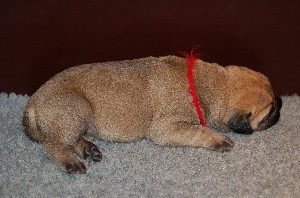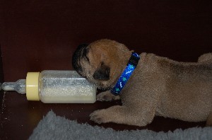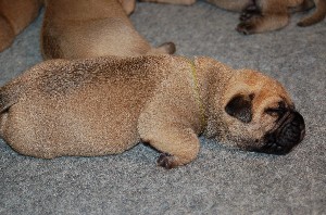 | Weer wat nieuwe foto's gemaakt op 2 december. De pups hebben op deze foto's net gedronken en dan is het al slapende lekker uitbuiken. De pups zijn sinds hun geboorte nu allemaal ongeveer 1 kilo aangekomen en wegen nu tussen de 1.500 en 1.750 gram. | |