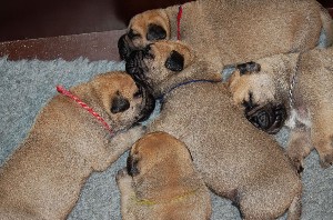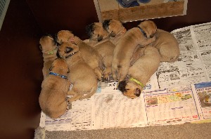 | De laatste foto dat alle pups nog bij elkaar in hun werpkist liggen. Na vandaag gaan de pups langzaam maar zeker naar hun nieuwe baasjes. | |