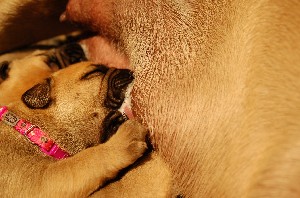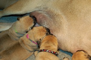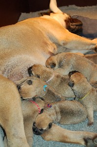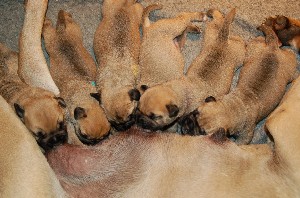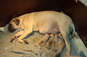 | Nieuwe foto's van de pups gemaakt op 26 november. Hier zijn de pups dus 4 dagen oud. Het wordt al aardig druk bij Shana als de heren en dames allemaal tegelijkertijd willen drinken.... | |