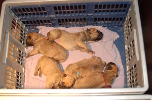 | Vijf van de negen pups lekker onder de warmtelamp. | |