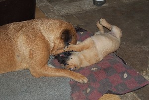 | De pups op de foto zondag 16 december 2007. Op de onderste foto's liggen de pups bij onze multifunctionele Gallyon die afwisselend dienst doet als tante, klimrek, poetsdoek voor papbekkies, enz enz.... | |